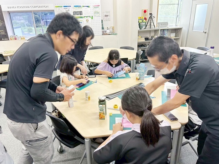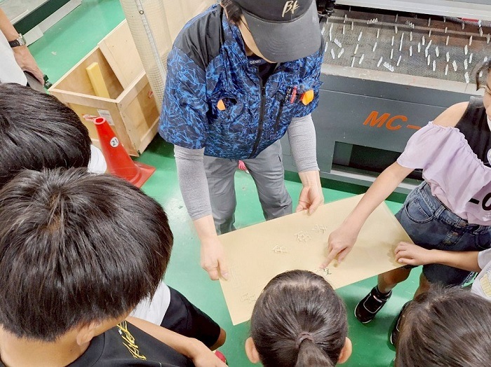 工場見学の後の表札作りではシート課の方々にご協力を頂いて、苦戦しながらも素敵な表札が完成。ふれあいメンバー発案の某キャラクターシールのお土産などもあり、とても楽しい体験会になったと思います。