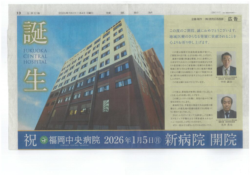 「福岡中央病院」様の新病院開院を心からお慶び申し上げます。
