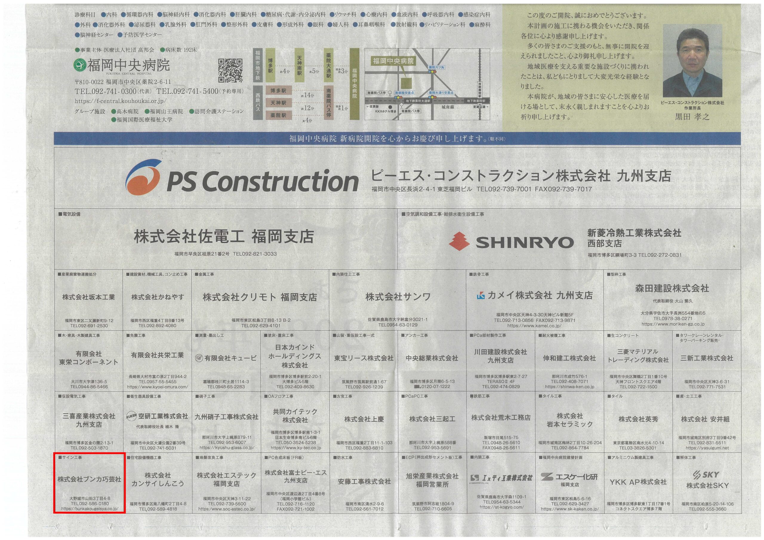 弊社がサイン工事をお手伝いさせていただきました、「医療法人社団高邦会 福岡中央病院」様の落成広告が掲載されましたので紹介いたします。