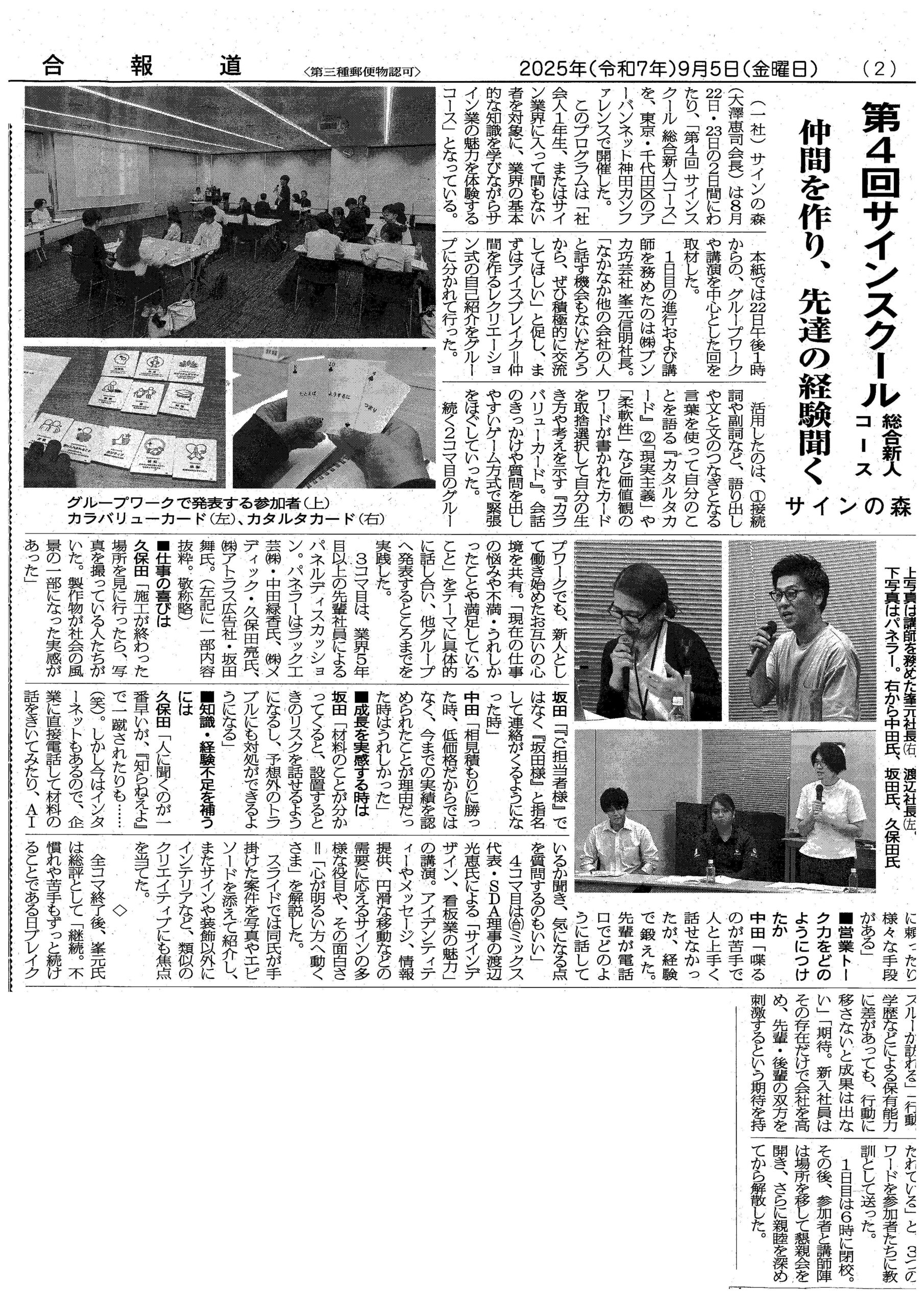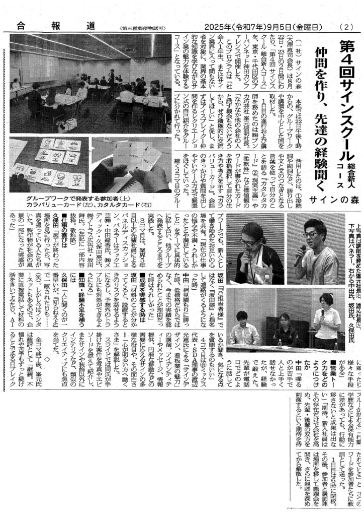 サインの森の「第4回サインスクール 総合新人コース」の記事が掲載されました! 2025年9月16日 最終更新日時 : 2025年9月16日 staff 2025年9月5日(金)の総合報道にて、弊社社長も講師を務め、社員も参加させていただいた、サインの森主催「第4回サインスクール 総合新人コース」の記事が掲載されましたので紹介いたします。 サイン業界に入って間もない者を対象に、業界の基本的な知識を学びながらサイン業の魅力を体験することができ、参加者と仲良くなるアイスブレイクや、先輩社員からお話を聞くパネルディスカッション、(合)ミックス代表の渡辺光恵氏の講演など、さまざまな学ぶ機会がありました。 ぜひご覧ください!