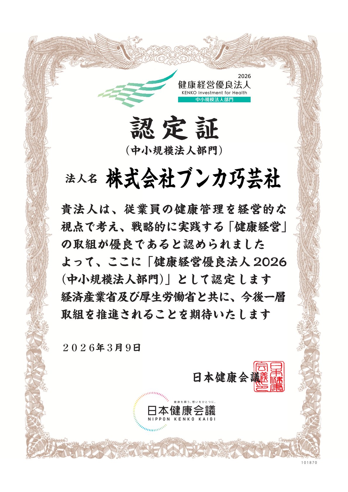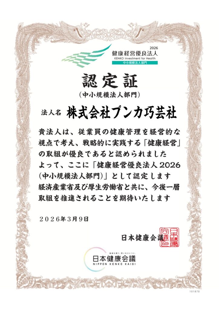 今回も『健康経営優良法人2026』へ認定されました! 2026年4月2日 最終更新日時 : 2026年4月2日 staff 今回も弊社の健康に関する取り組みを評価していただき、『健康経営優良法人2026』の認定をいただきましたので紹介いたします。 『健康経営優良法人認定制度』とは、特に優良な健康経営を実践している大企業や中小企業等の法人を「見える化」することで、従業員や求職者、関係企業や金融機関などから社会的な評価を受けることができる環境を整備することを目的に、日本健康会議が認定する顕彰制度です。 引き続き健康への取り組みを行っていきます!