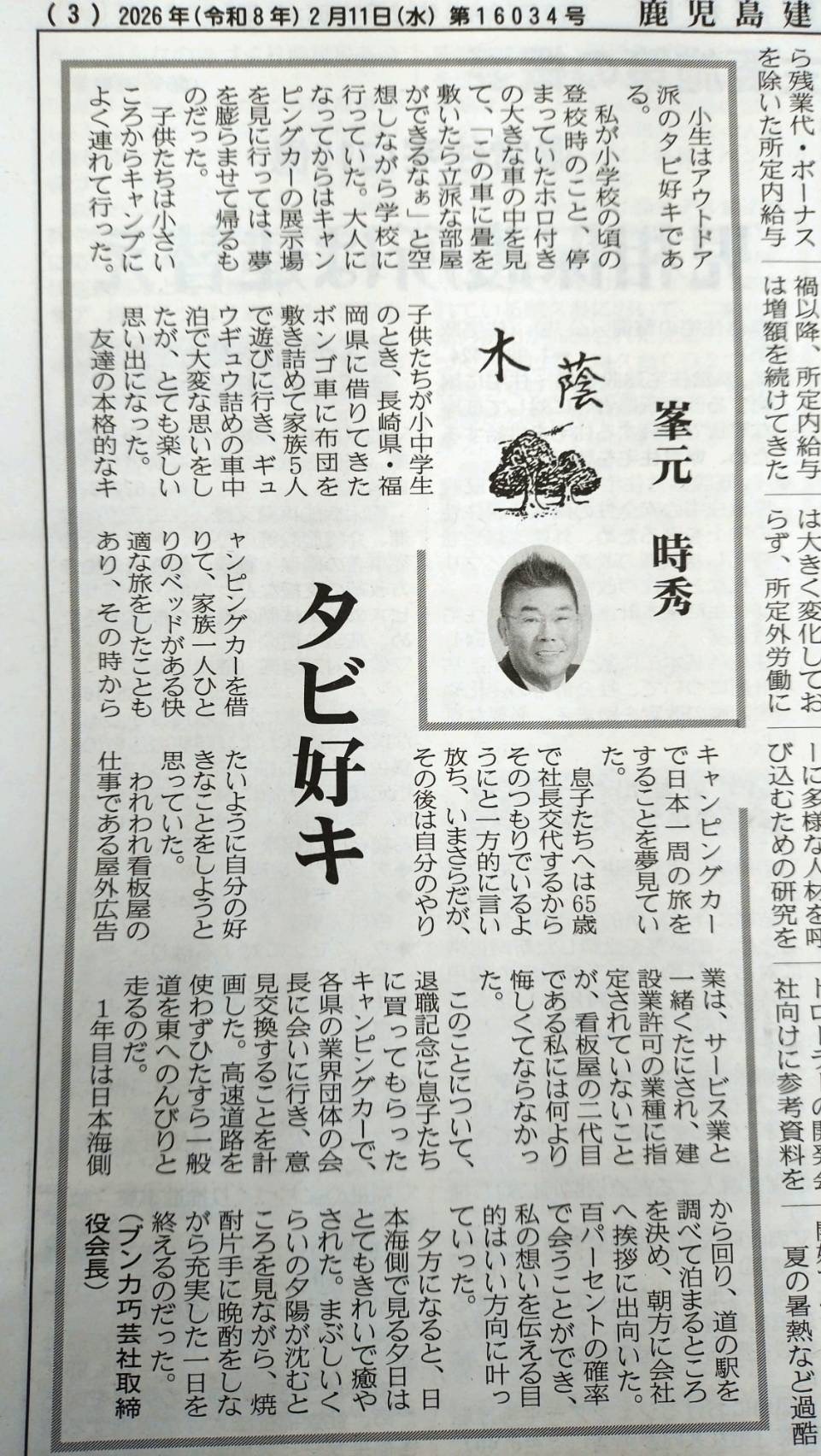 弊社会長が鹿児島建設新聞にて紹介されました! 2026年2月16日 最終更新日時 : 2026年2月16日 staff 弊社の取締役会長である峯元 時秀が、鹿児島建設新聞のコラム「木蔭」にて、掲載されましたので紹介いたします。 ぜひご覧ください。