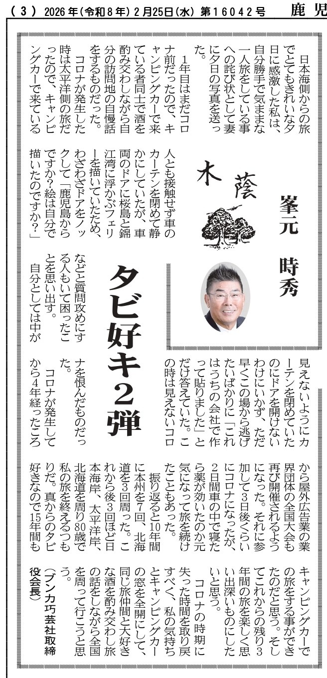 <第2弾>弊社会長が鹿児島建設新聞にて紹介されました! 2026年2月26日 最終更新日時 : 2026年2月26日 staff 弊社の取締役会長である峯元 時秀が、先々週に続き今回も鹿児島建設新聞のコラム「木蔭」にて掲載されましたので紹介いたします。 第1弾とあわせてぜひご覧ください。